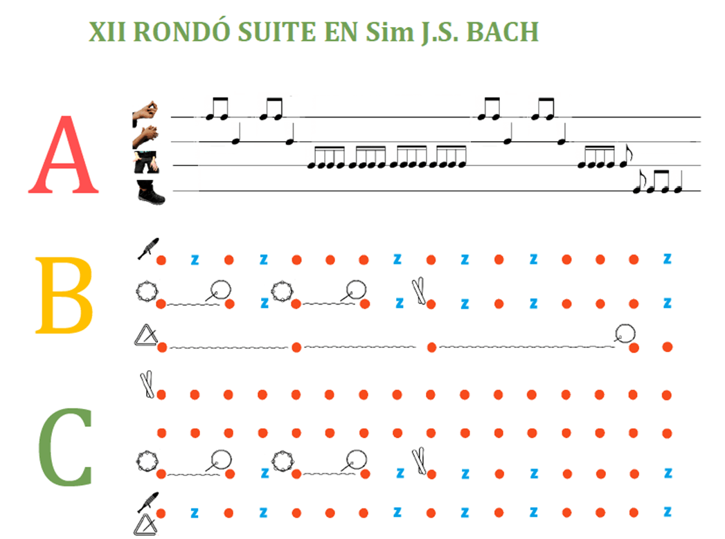 Se forma una fila, y el primero de sus componentes lleva un balón. La fila marcha al ritmo que toca el profesor en el piano; cuando el profesor ejecuta un trino en el registro agudo, medio o bajo, el primer niño de la fila pasará el balón al niño que está detrás de él mediante los movimientos que el profesor habrá señalado previamente. Estos serán: para el trino agudo, se pasará el balón por encima de la cabeza; para el trino en el registro medio, por el lado derecho y a la altura de la cintura; para el trino en el registro grave, se pasará el balón por entre las piernas.